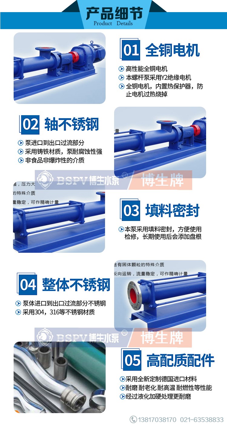 博生牌G型單螺桿泵制造標準分為食品級、化工級、日用品型、特種型等四大系列,產品的核心部件和密封裝置,根據介質的不同特性,采用不同的材質和不同的密封形式,以滿足各種物料的需要。