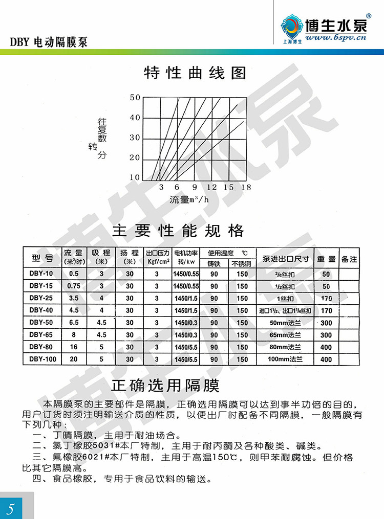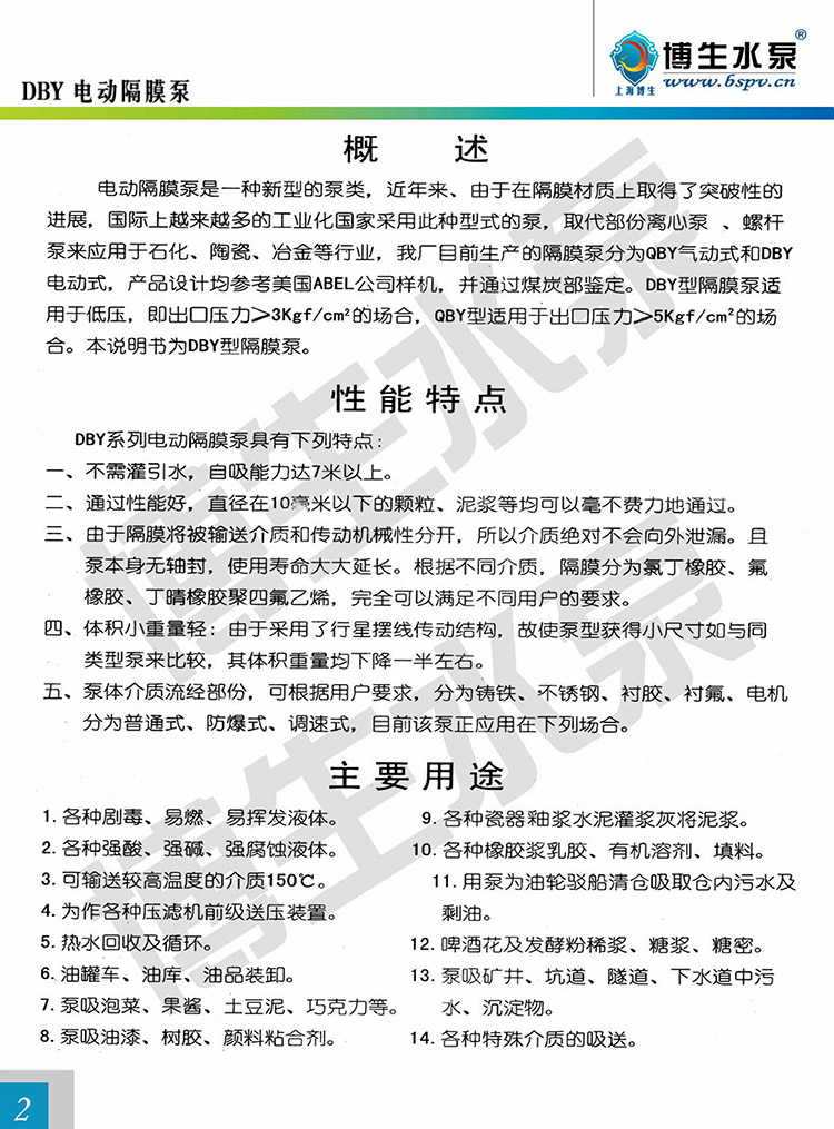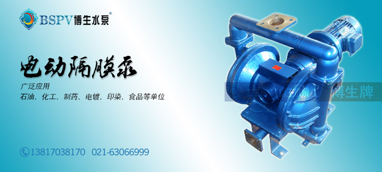 博生公司生產的上海博生DBY-15型電動隔膜泵是一種新型的泵種,近年來,由于在隔膜材料取得了突破性的進展,國際上越來越多的工業化國家要用此種型式的泵,上海博生DBY-15型電動隔膜泵代替部份離心泵、螺桿泵,來應用于石化、陶瓷、冶金等行業。