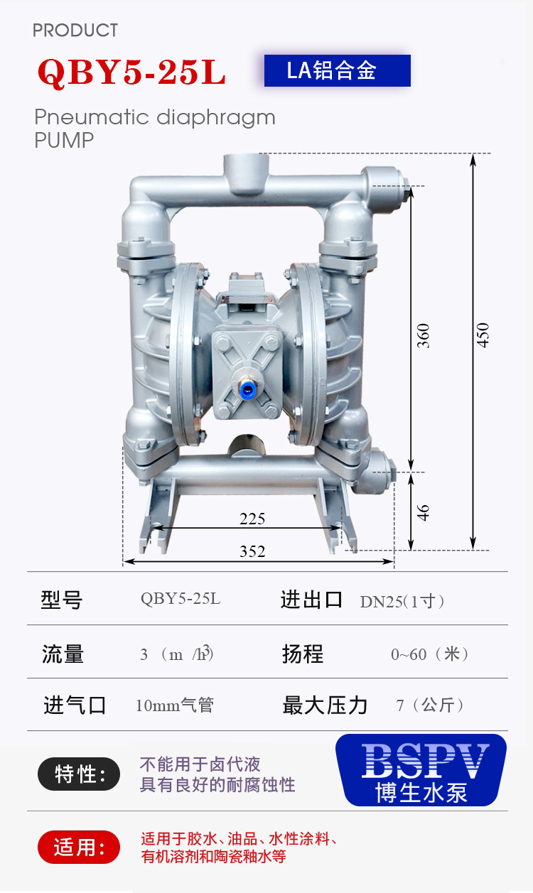 上海博生水泵QBY5-40L型鋁合金氣動隔膜泵,油墨泵,耐腐蝕氣動隔膜泵,污水排污氣動隔膜泵系列第五代氣動隔膜泵是一種新型輸送機械,采用壓縮空氣為動力源,對于各種腐蝕性液體,帶顆粒的液體,高粘度、易揮發、易燃、劇毒的液體,均能予以抽光吸盡。其性能參數與聯邦德國的WLLDENPVMPS、美國的MARlOWPUMPS相近。